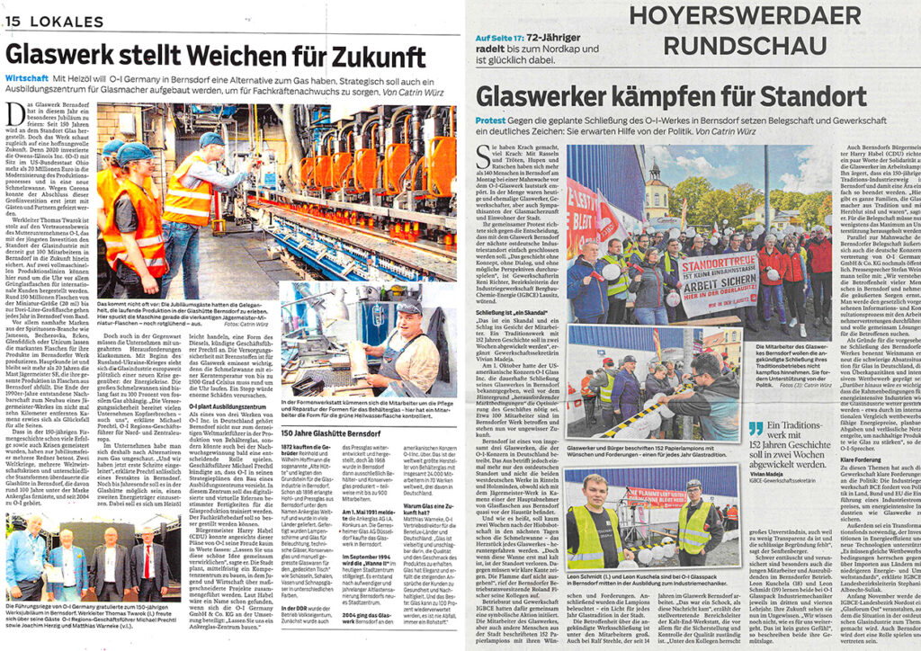 Der Konzern OI Glasspack hat überraschend bekanntgegeben, dass er den Traditionsstandort Bernsdorf schließen will und unsere Glasswanne heruntergefahren.
